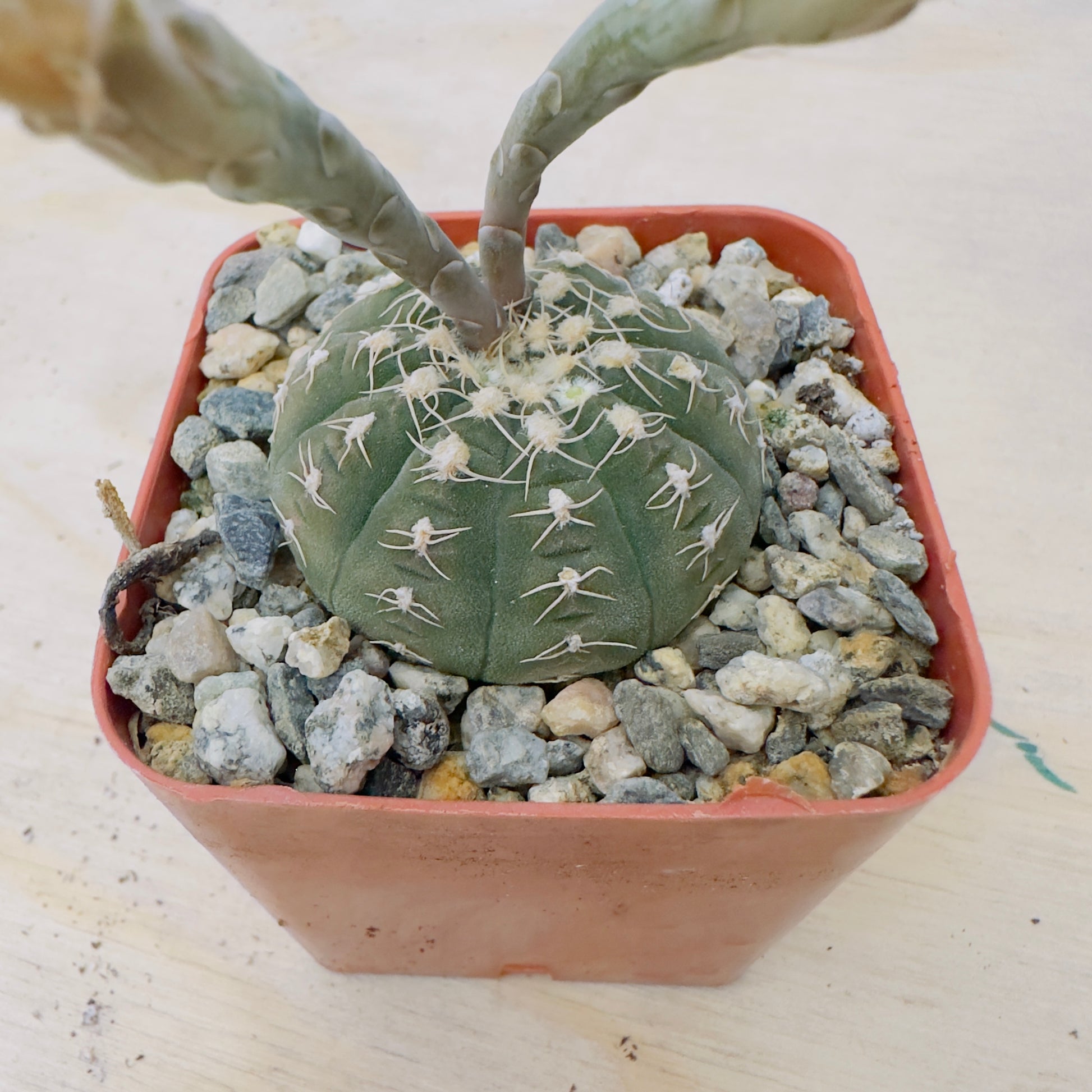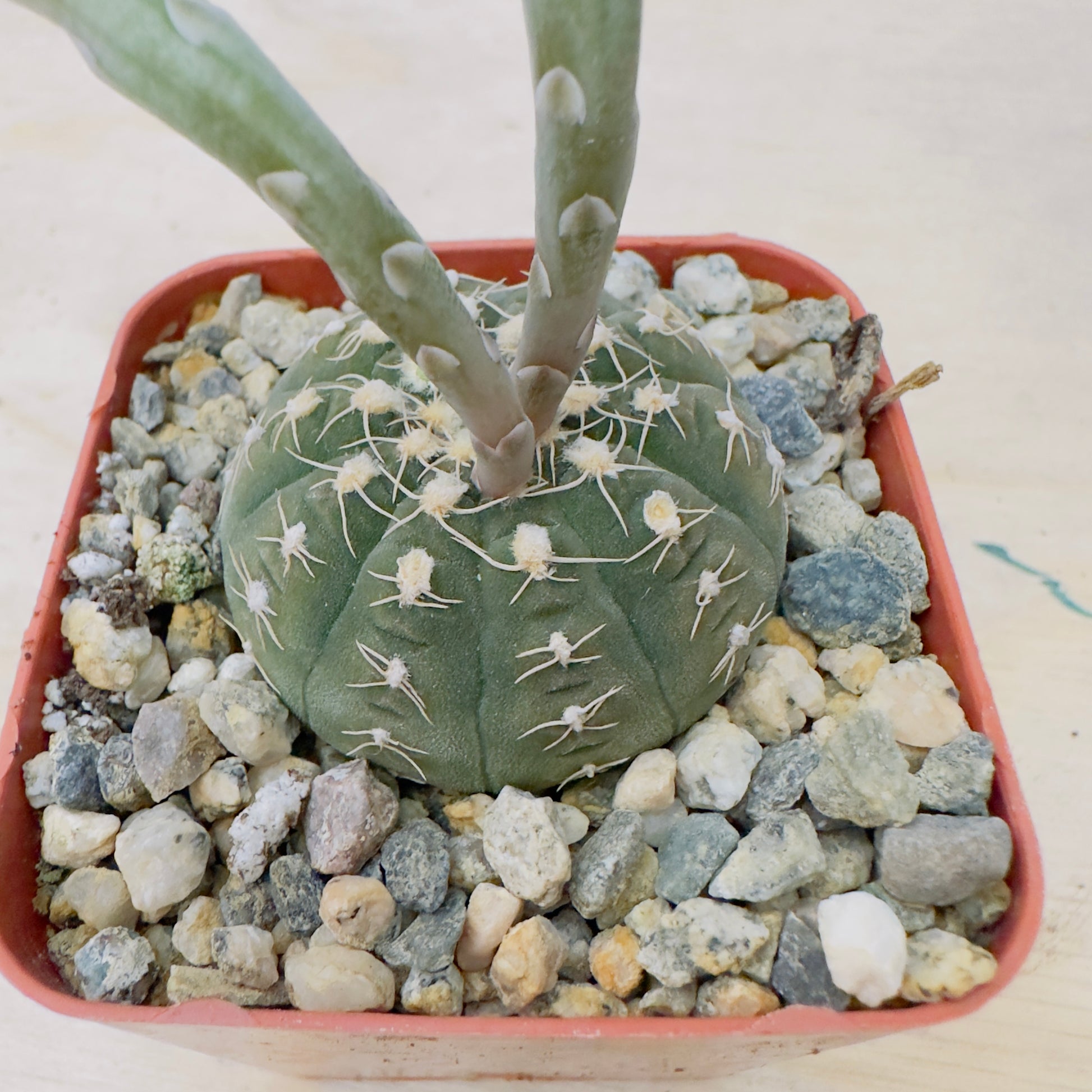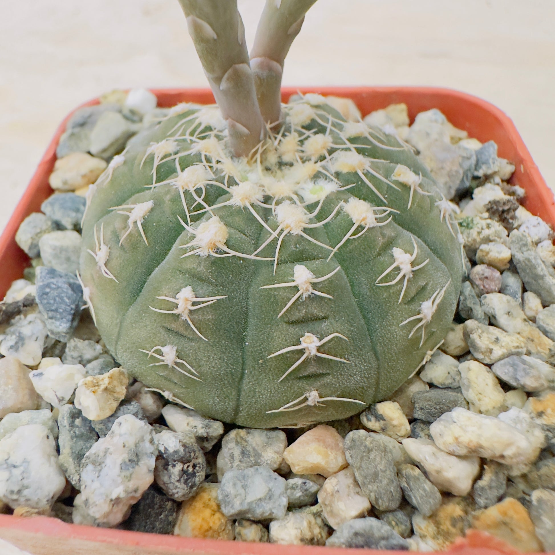 Gymnocalycium spegazzinii is a compact, globular cactus species known for its rugged, armored look and striking symmetry. Its body is typically grayish-green to bluish-green, sometimes flushed with purple or red under stress. The epidermis is matte and ribbed with 8–12 pronounced ribs divided by deep furrows.