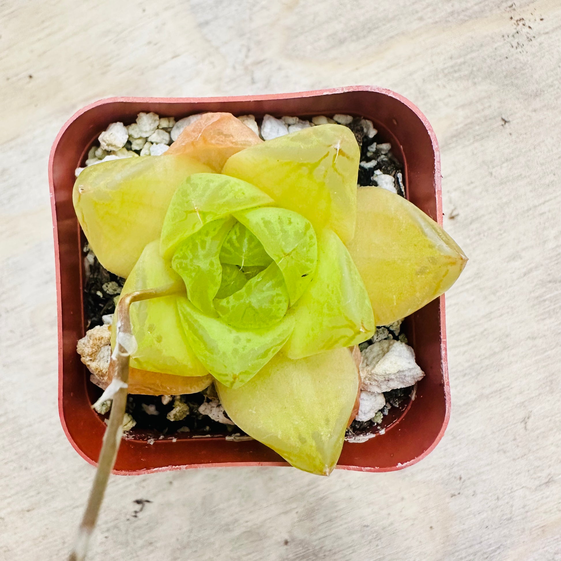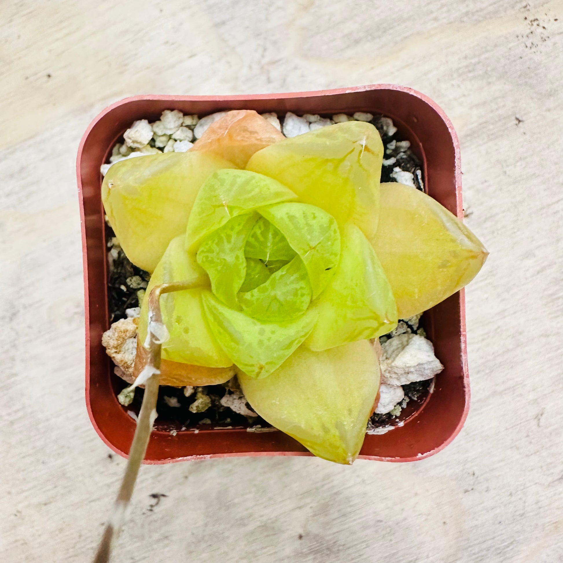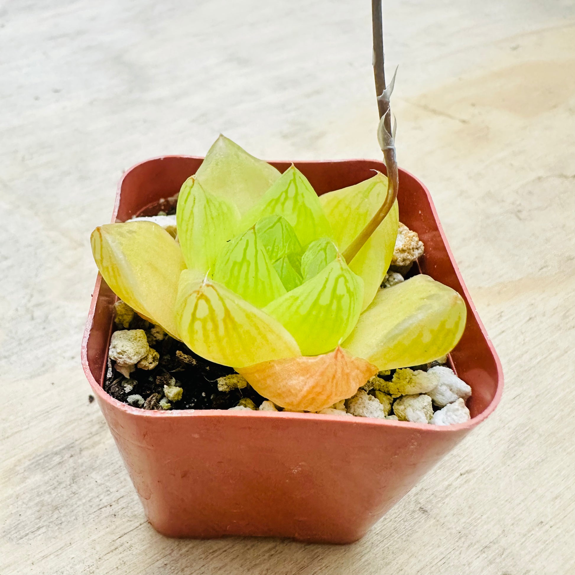 Haworthia cymbiformis ‘Cathedral Window’ is a compact rosette-forming succulent known for its translucent leaf tips resembling stained glass windows. The pale green to bright green leaves are thick, fleshy, and shaped like small boats, often lined up symmetrically in clusters. The “windows” on the leaf tips allow sunlight to penetrate deep into the leaf tissues, a trait adapted for low-light environments. Each rosette grows up to 5–8 cm (2–3 inches) in diameter.