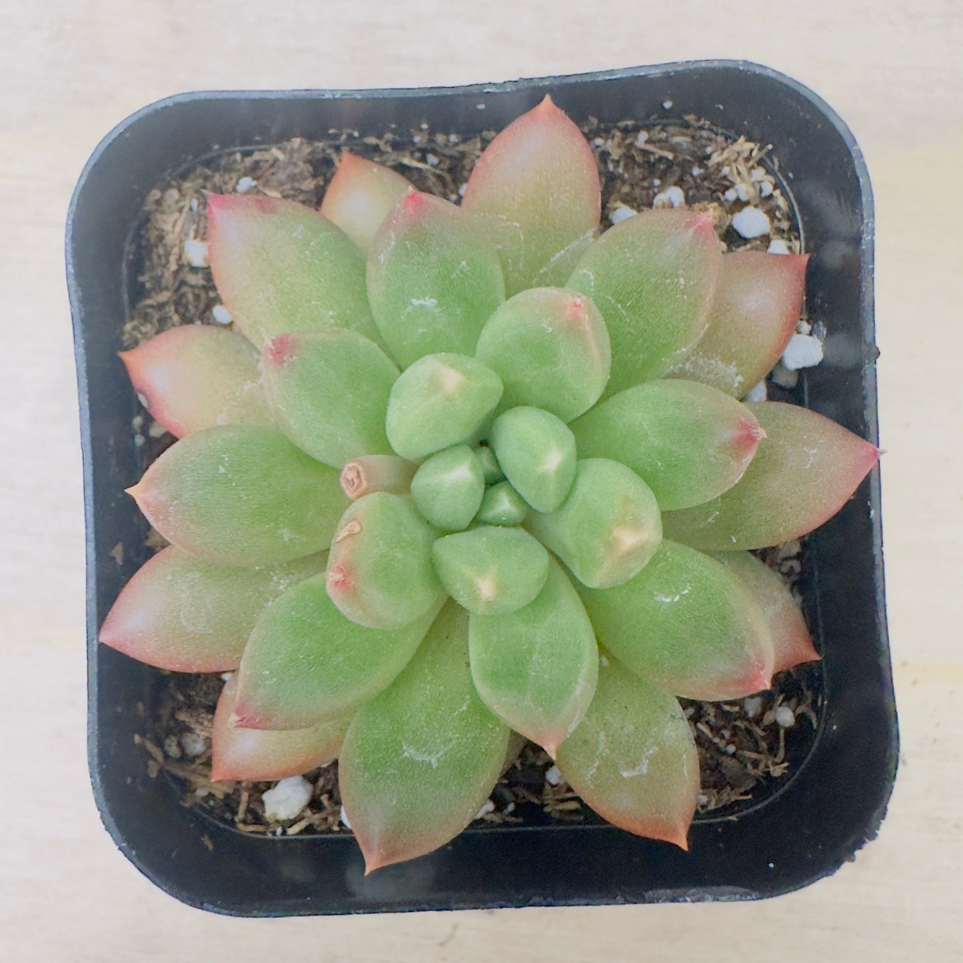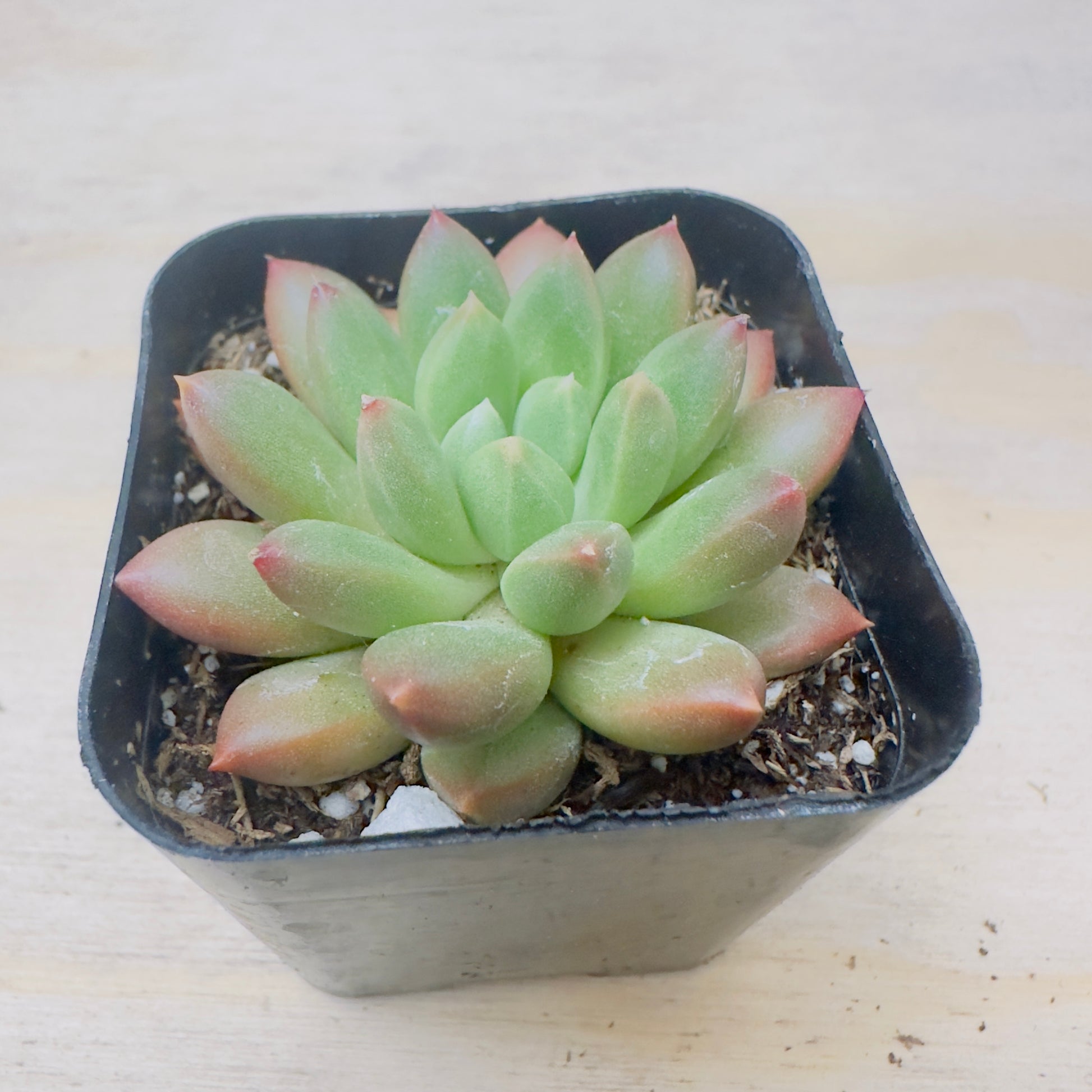 Rosettes typically grow up to 10–15 cm (4–6 inches) in diameter and may develop short stems with age. The leaf tips may blush pink or violet under stress, giving the plant a soft jewel-like appearance.